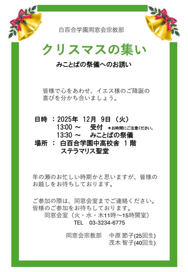 2025年12月9日、白百合学園内のステラマリス聖堂でクリスマスの集い「みことばの祭儀」を行いました。当日は、恩師を含めたくさんの同窓生にご参加いただきました。 まず、皆で主の祈りを唱え、同窓生のオルガン演奏による「アヴェ...