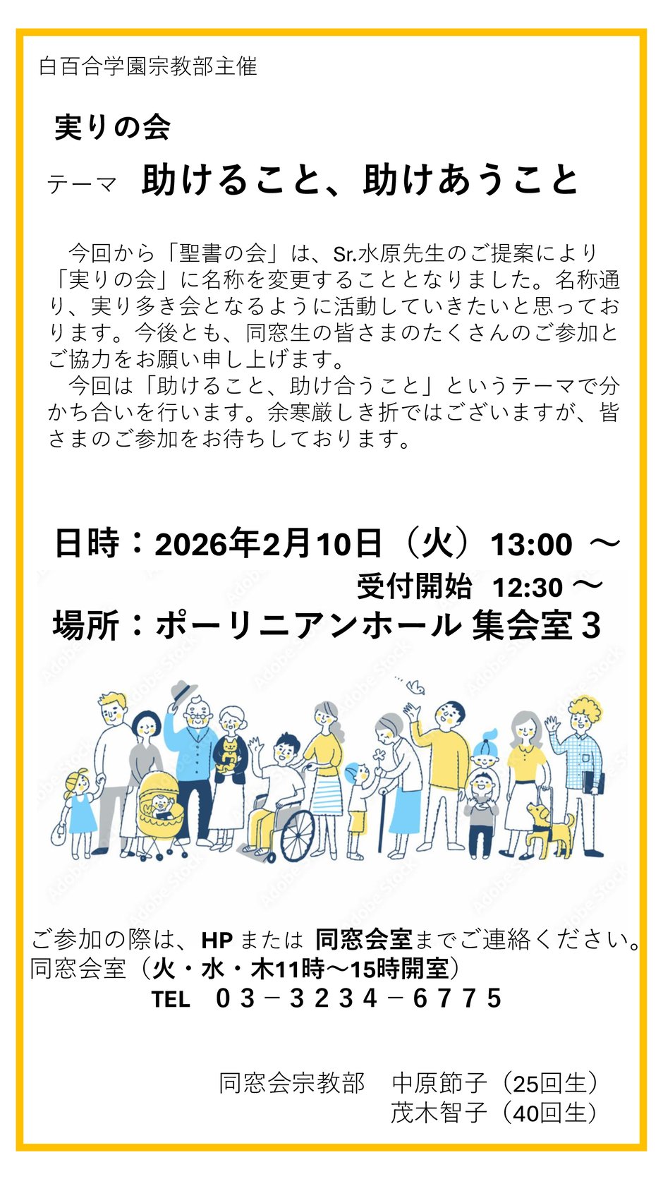 2025年10月14日、ポーリニアンホールにて、Sr.水原先生を囲んで聖書の会を開催いたしました。 今回は「しあわせとは」というテーマでわかち合いを行いました。当日は、初めて参加される方を含めたくさんの同窓生が集まりました。...