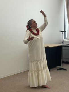前半はマヌワイさんの踊りの他、フラとの出会い、小学校での思い出などさまざまなお話をしていただき、歳が近い同窓生の方々は当時を懐かしんでいらっしゃいました。