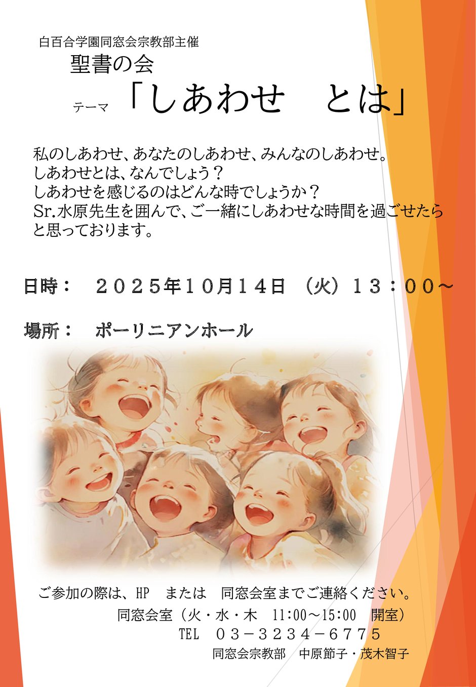 宗教部 · 2025/09/05 聖書の会(10月)「しあわせ とは」のお知らせ ◆申込み方法 同窓会室までご連絡いただくか、下記の【宗教部ご連絡フォーム】からお申込みください。 なお、お申込み受領の返信はいたしませんのでご了承ください。 宗教部ご連絡フォーム tagPlaceholderカテゴリ: