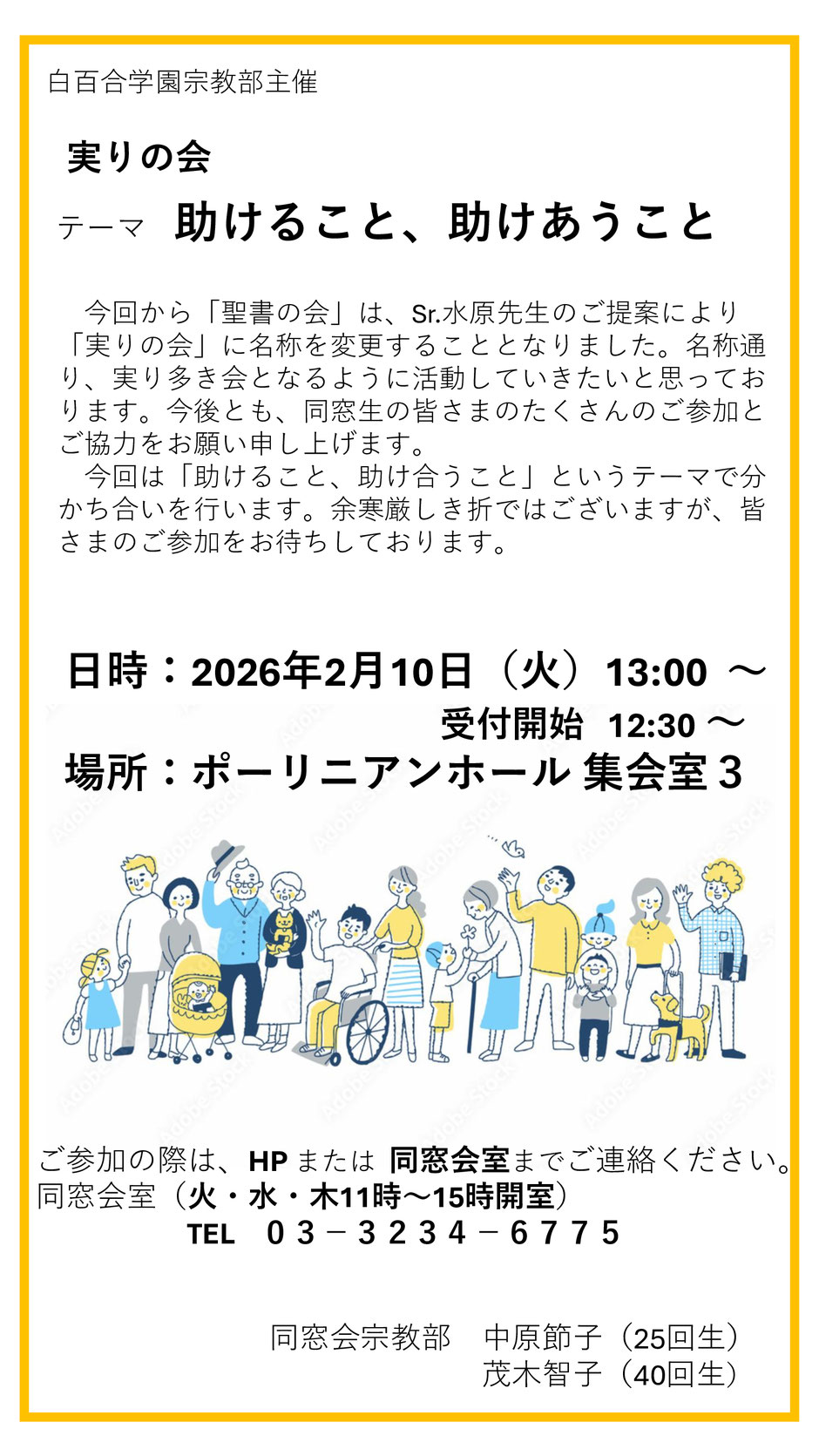 宗教部 · 2026/01/11 実りの会(2月)「助けること、助けあうこと」のお知らせ ◆申込み方法 同窓会室までご連絡いただくか、下記の【宗教部ご連絡フォーム】からお申込みください。 なお、お申込み受領の返信はいたしませんのでご了承ください。 宗教部ご連絡フォーム tagPlaceholderカテゴリ: